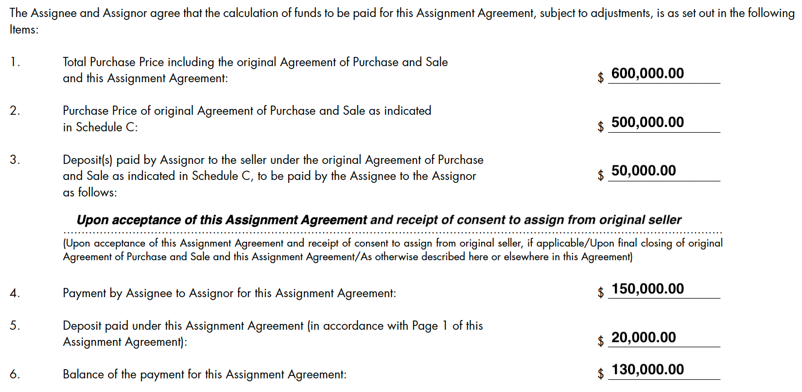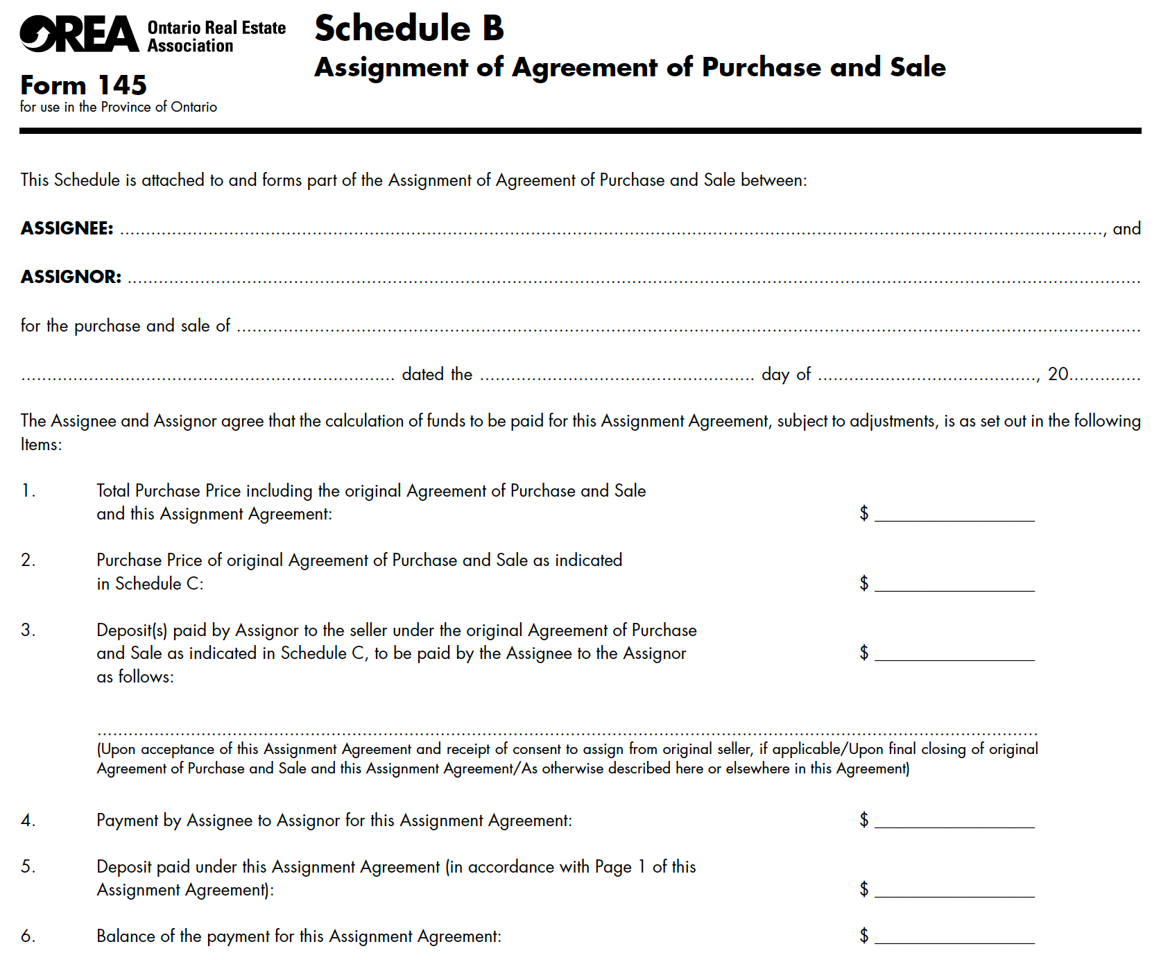 If you've never handled an assignment, the Assignment of Agreement of Purchase and Sale (OREA Form 145, or Form 150 for condos) includes a Schedule B that outlines the payments to be made in the Assignment Transaction.